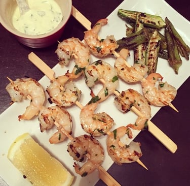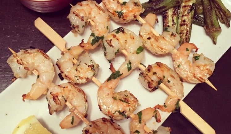 Grelhe os espetinhos de cada lado até que os camarões estejam rosados e cozidos, cerca de 2-3 minutos por lado.